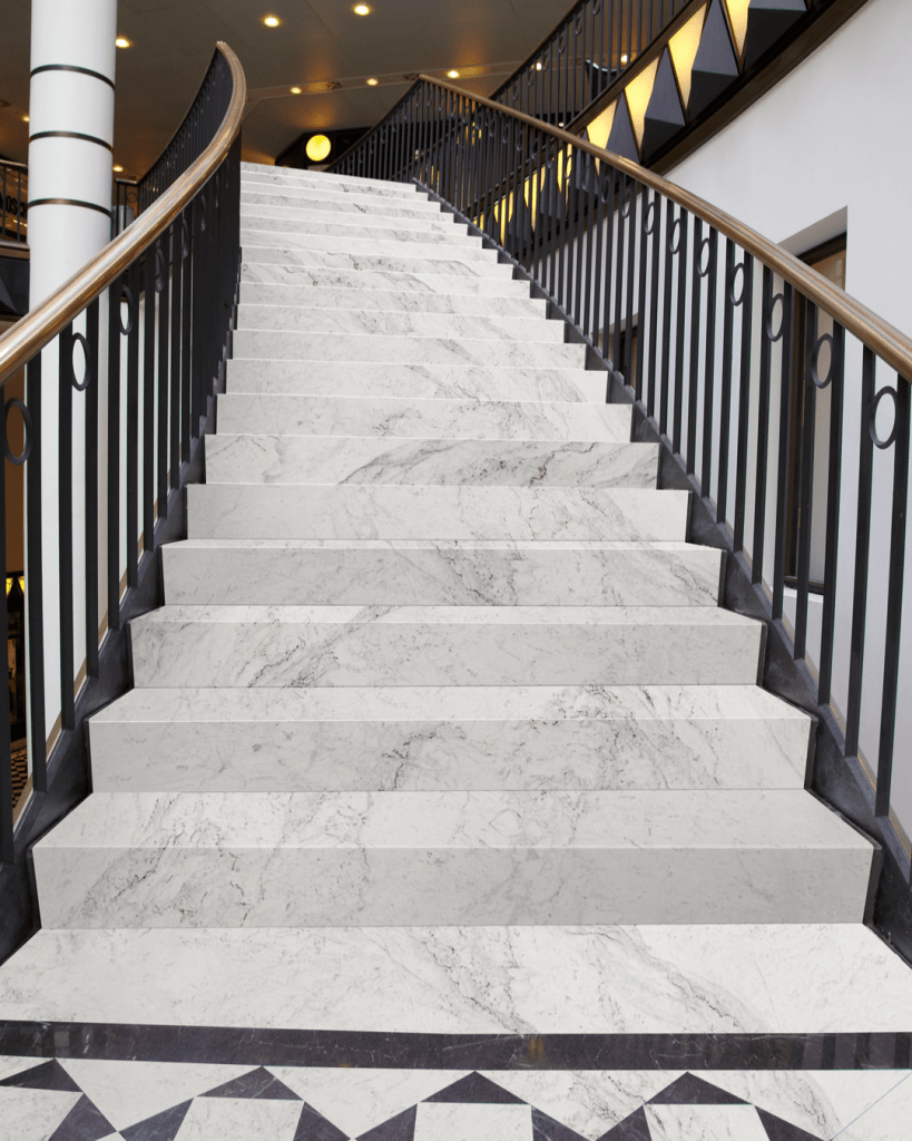 Mais do que simples ligações entre andares, os degraus revestidos com mármore tornam-se verdadeiras esculturas arquitetônicas. Além disso, são duráveis e contribuem para projetos com identidade visual marcante: