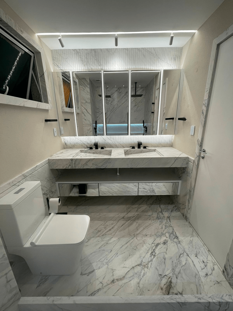 A estética desse mármore dolomítico vai além de tendências passageiras: é um clássico atemporal, alinhado ao conceito de Quiet Luxury. Versátil, pode ser aplicado em pisos, paredes ou bancadas, criando continuidade visual e proporcionando uma sensação de amplitude aos ambientes. No projeto do banheiro que mostramos, o uso do material nas paredes e no piso do chuveiro garante uma continuidade visual incrível, ampliando o espaço e trazendo uma sensação de grandiosidade.