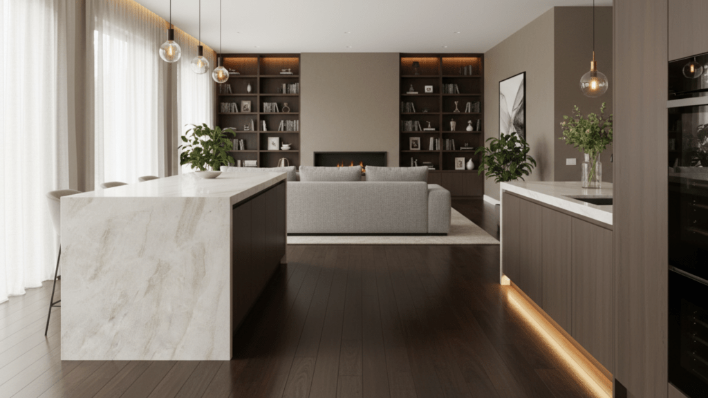 É a forma mais imediata de contraste. Uma bancada de Taj Mahal sobre um piso levemente mais escuro cria equilíbrio sem esforço, suavizando o olhar.