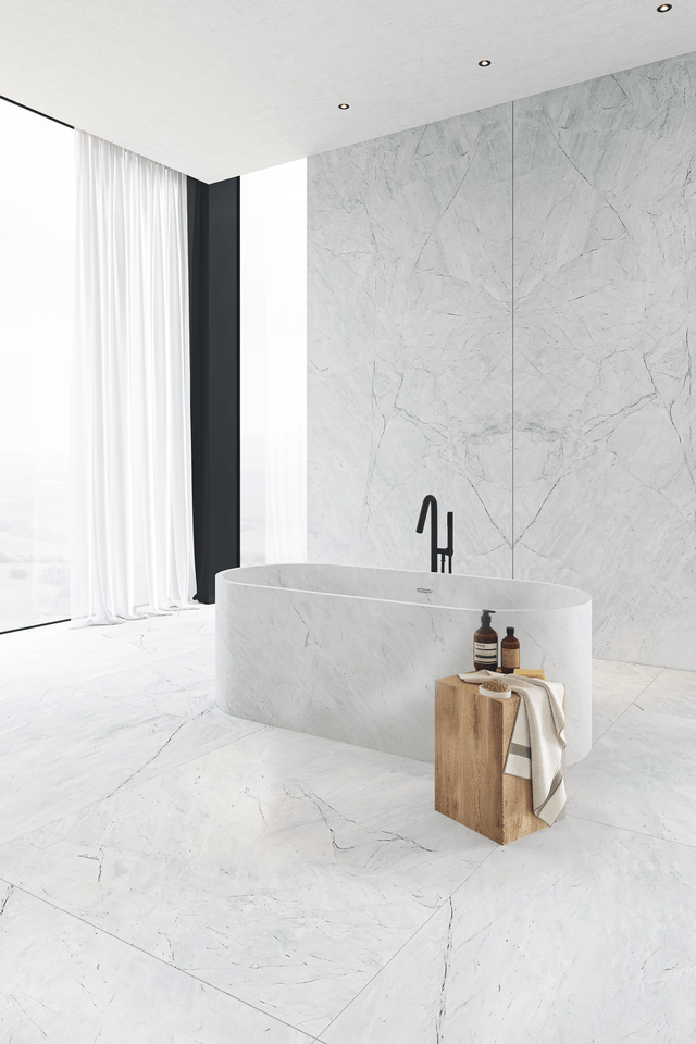 O mármore dolomítico Matterhorn também foi apresentado no espaço, destacando-se por sua estética refinada e características únicas.