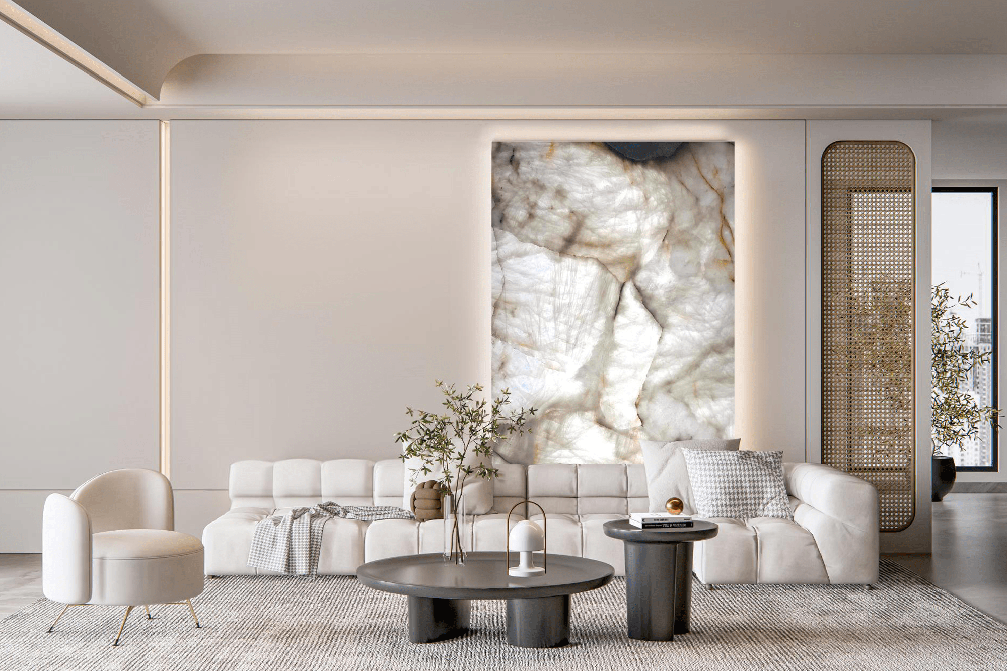 A pedra Patagonia exibe qualidades distintas, assim como a região que lhe dá nome, revelando sua força natural de forma sutil e sofisticada. Destaca-se por amplas áreas em tons claros, intercaladas com cristais translúcidos que enriquecem sua composição. Um tesouro natural atemporal, ideal para revestir grandes superfícies, tanto verticais quanto horizontais, permitindo que o olhar mergulhe em sua intensidade e conferindo aos ambientes uma atmosfera de encantamento único e memorável.