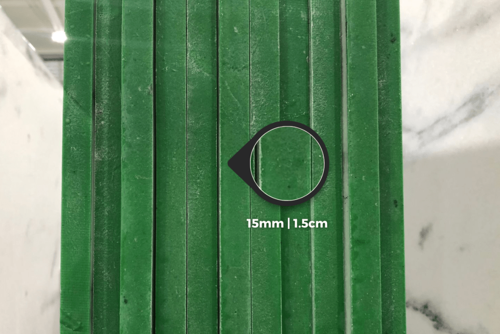Devido ao processo de produção especial e aos insumos aplicados, qualquer mármore cortado em 15mm tem a mesma resistência que uma chapa de 20mm (2cm), com a vantagem de pesar 25% menos. Além de tornar os processos de manuseio e corte das chapas muito mais ágeis, também acaba sendo um otimizador incrível de custos logísticos.